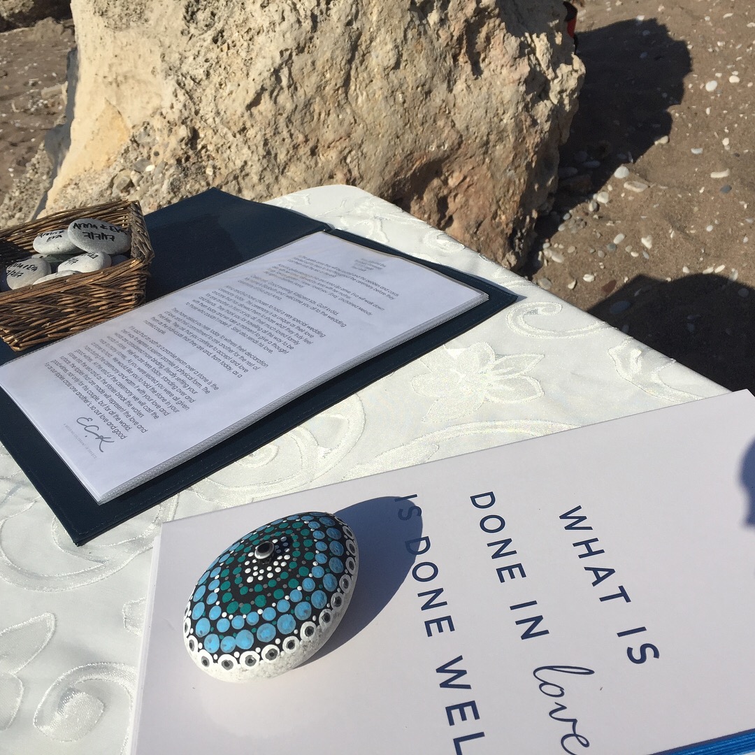 Another couple to bring the ceremony location into the ceremony itself were Anna and Eva. It is said that promises sworn next water and over a stone are more binding than any other so we went ahead with both! Our ceremony location was a tiny part of the beach with a sand and stone mix, so the day before we went together and collected small stones for the guests to make wishes on before casting them to the waves. I had already collected a larger stone to give to my super talented friend Jill from ‘Dragonfly Dots’ to work her magic on. We used this stone for the wedding vows and of course as a keepsake. It was a really special moment as the guests came to the water’s edge to cast their stones, a permanent presence to remain in an ever-changing sea.